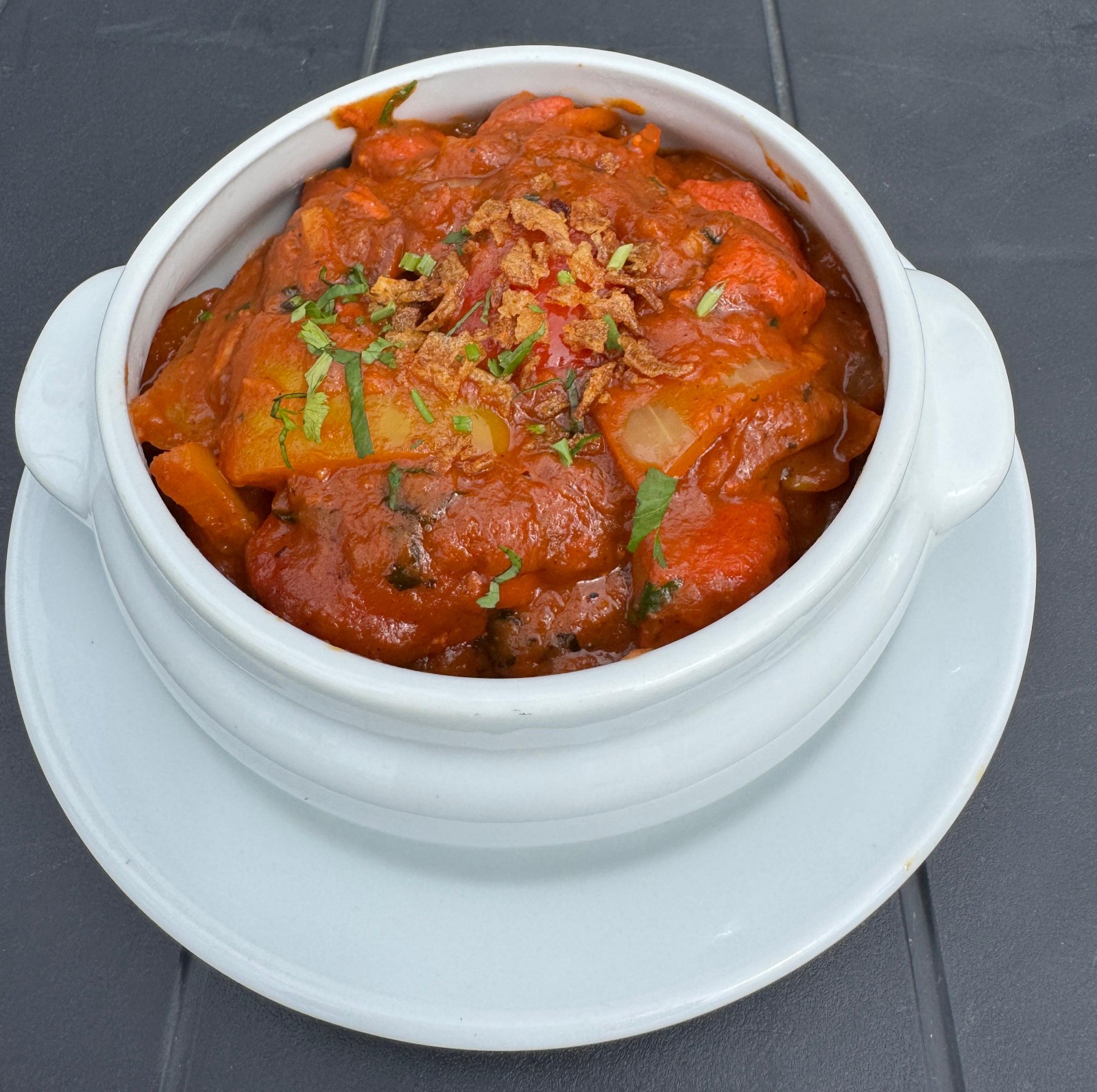 Boneless chunks of chicken grilled in the tandoor, served sizzling with onions and bell peppers